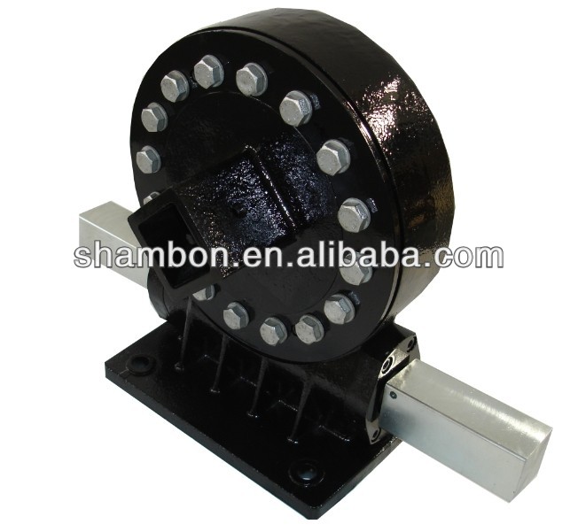 回轉(zhuǎn)驅(qū)動(dòng):采用回轉(zhuǎn)支承和環(huán)面包絡(luò)蝸桿結(jié)構(gòu),能達(dá)到多齒嚙合,具有傳動(dòng)扭矩大,運(yùn)行平穩(wěn)等特點(diǎn);以回轉(zhuǎn)支承為主體,同時(shí)可以承受較大