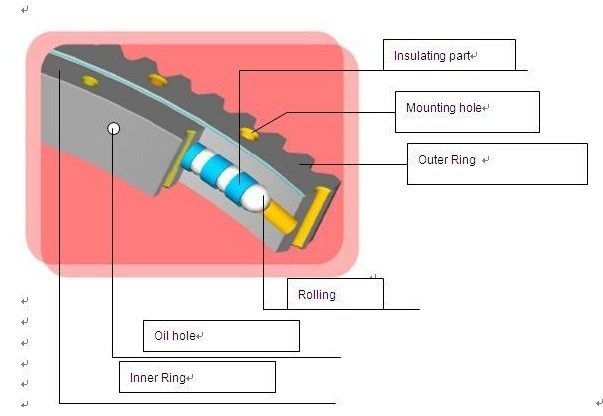 1) Make sure that the model is the same with the contract. 2) Make sure the slewing bearing is not damaged during the transportation. 3) Open the package in clean and dry environment. 4) The Bracket should have enough flexility to avoid the distortion of the slewing bearing and influence of its usage. 5)The installation datum plane and bracket installing plane should be clean,grease,burr,paint and other foreign bodys should be wiped off.